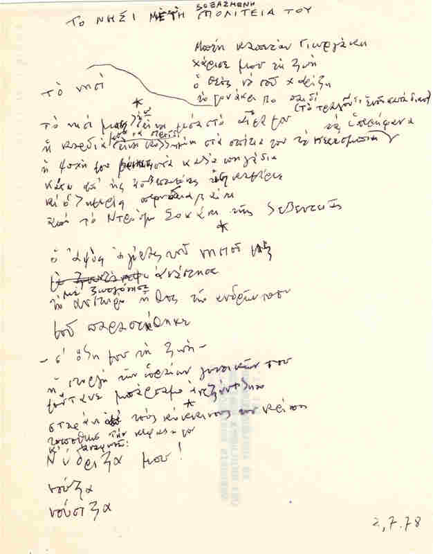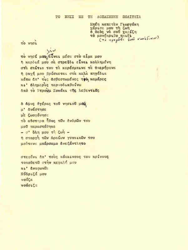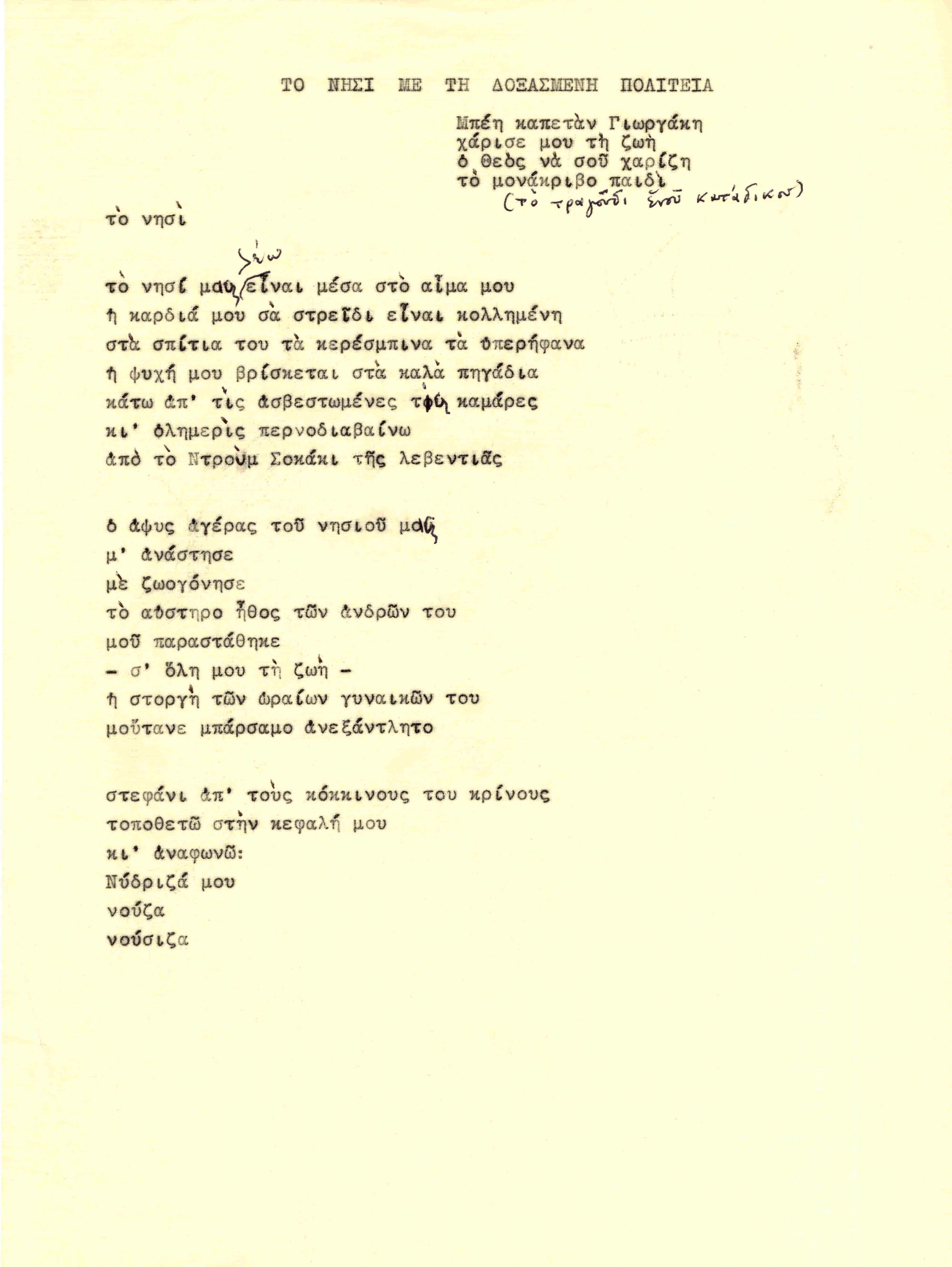 - Το ποίημα 'Το νησί με τη δοξασμένη πολιτεία του' σε χειρόγραφη και δακτυλόγραφη μορφή.